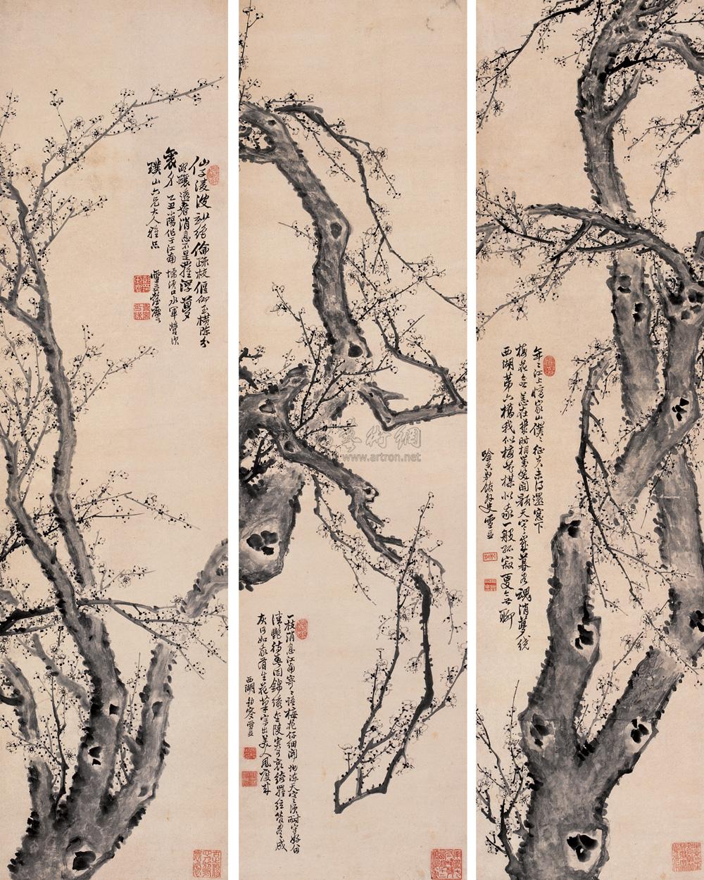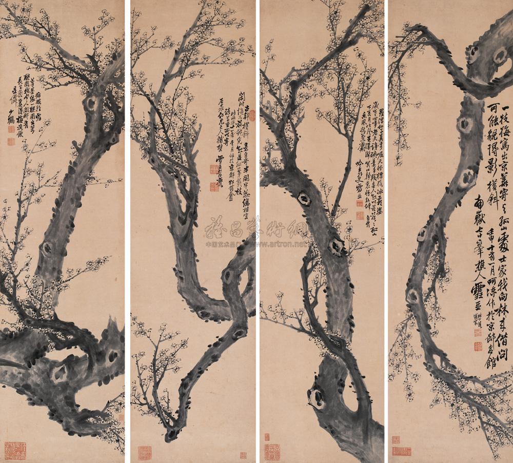 岁寒古梅屏 四屏 水墨纸本 |