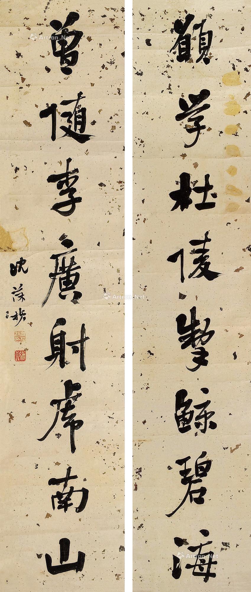 行书八言对联 镜片 水墨洒金蜡笺 |