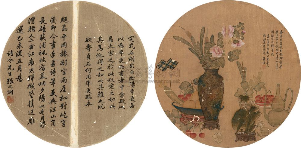 行书 清供 (两幅) 圆光扇面镜心 水墨/设色绢本 |