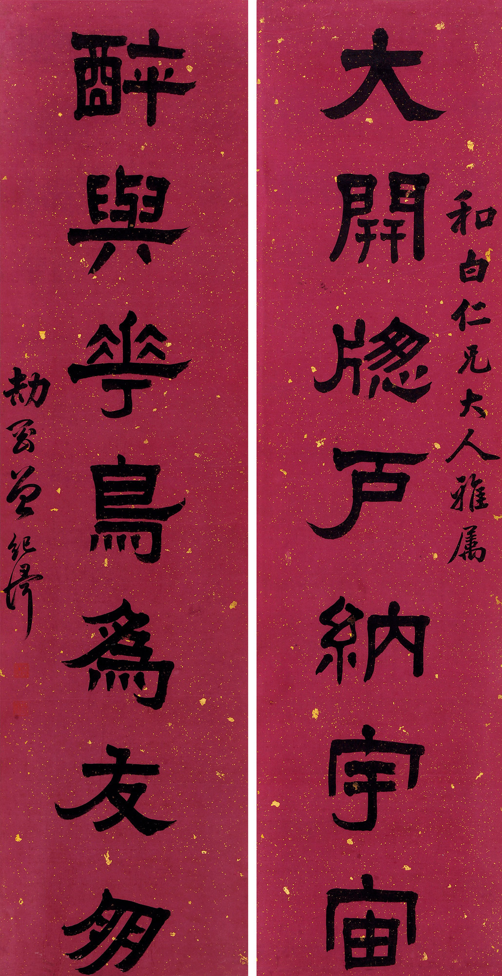 隶书七言联 立轴 水墨洒金红粉笺 |